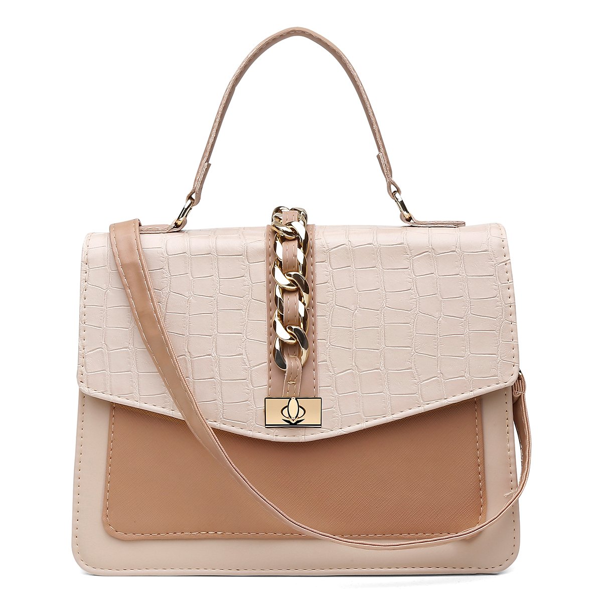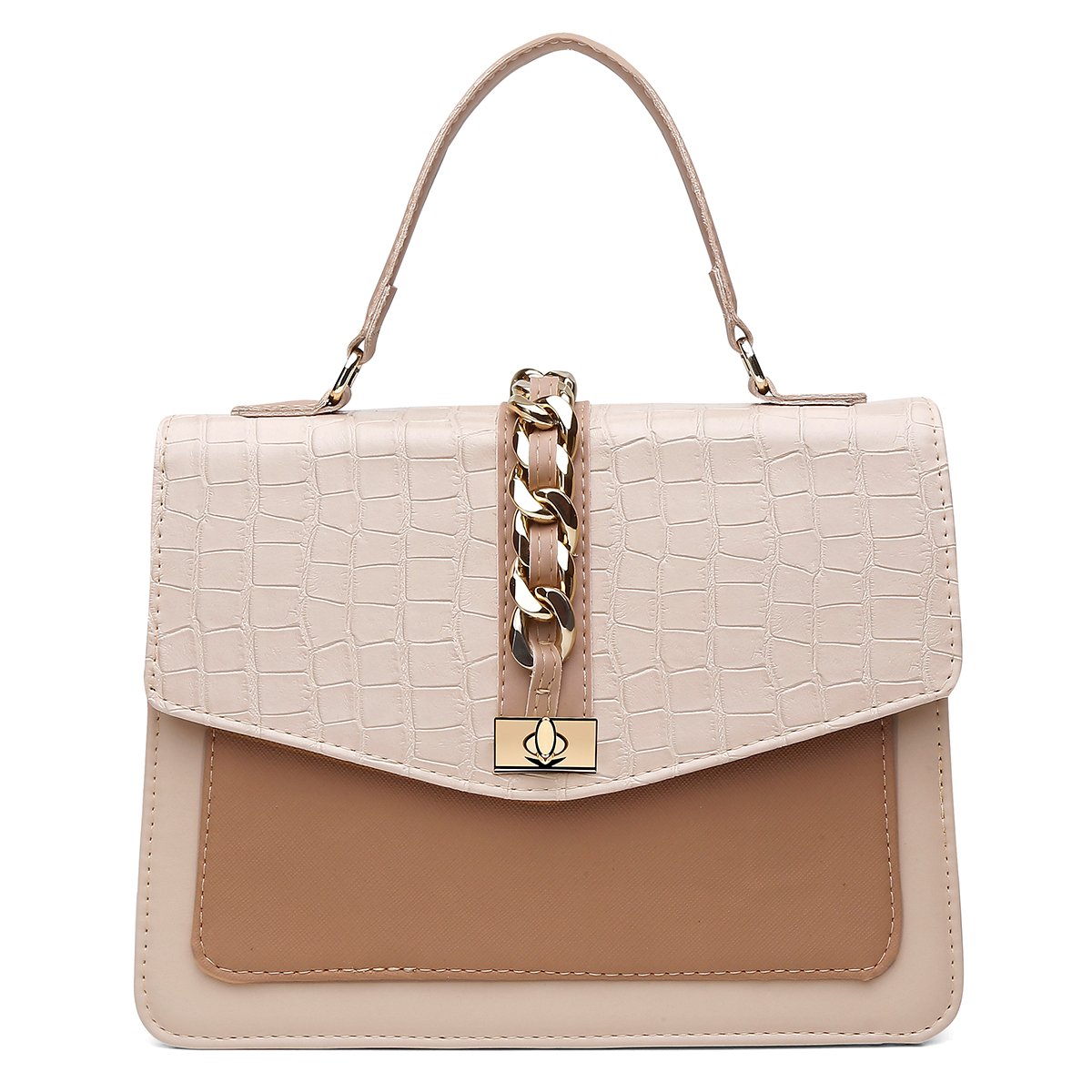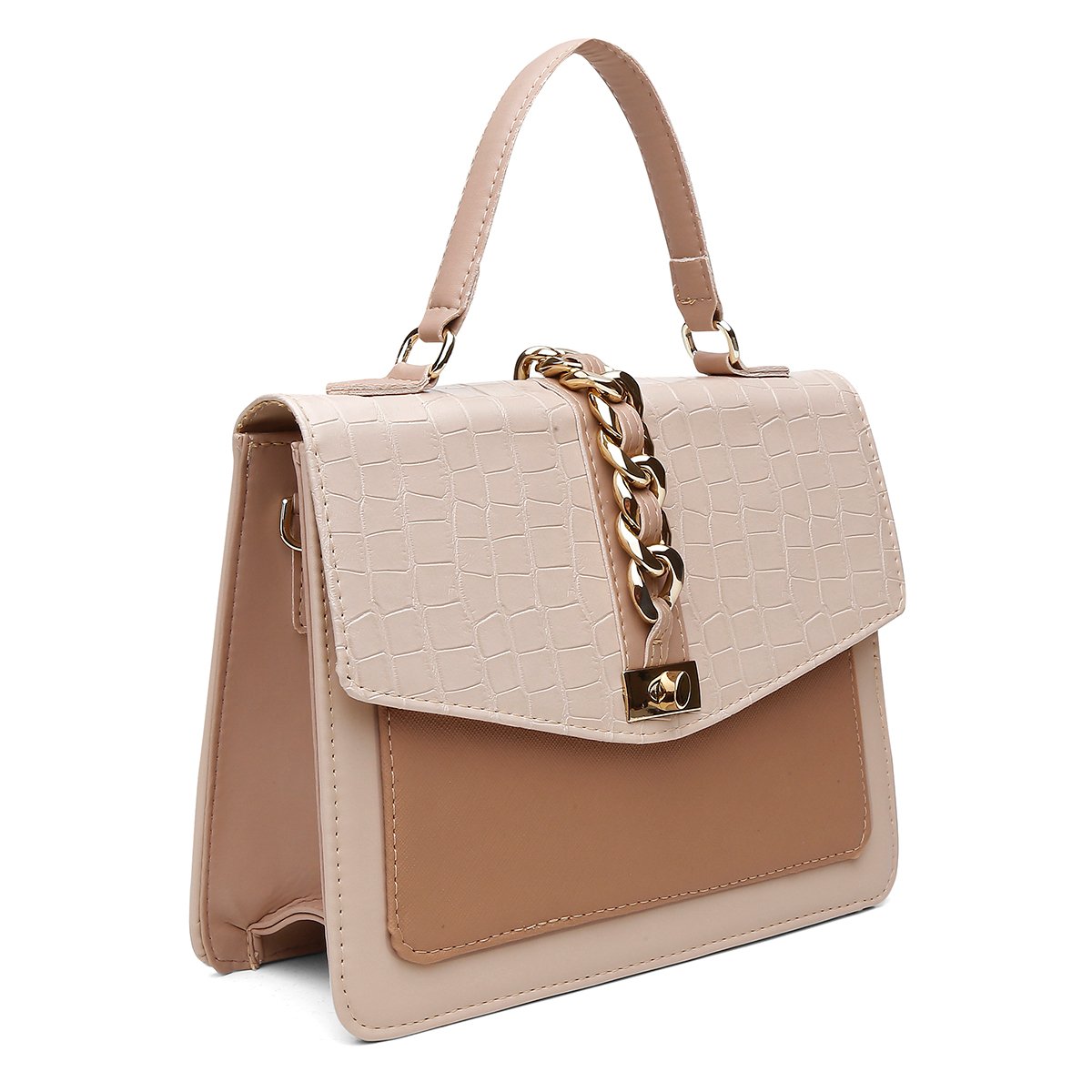 NUDE – Produzida sob o tom nude. Santorini amêndoa, croco amêndoa, prada amêndoa. Metal dourado.